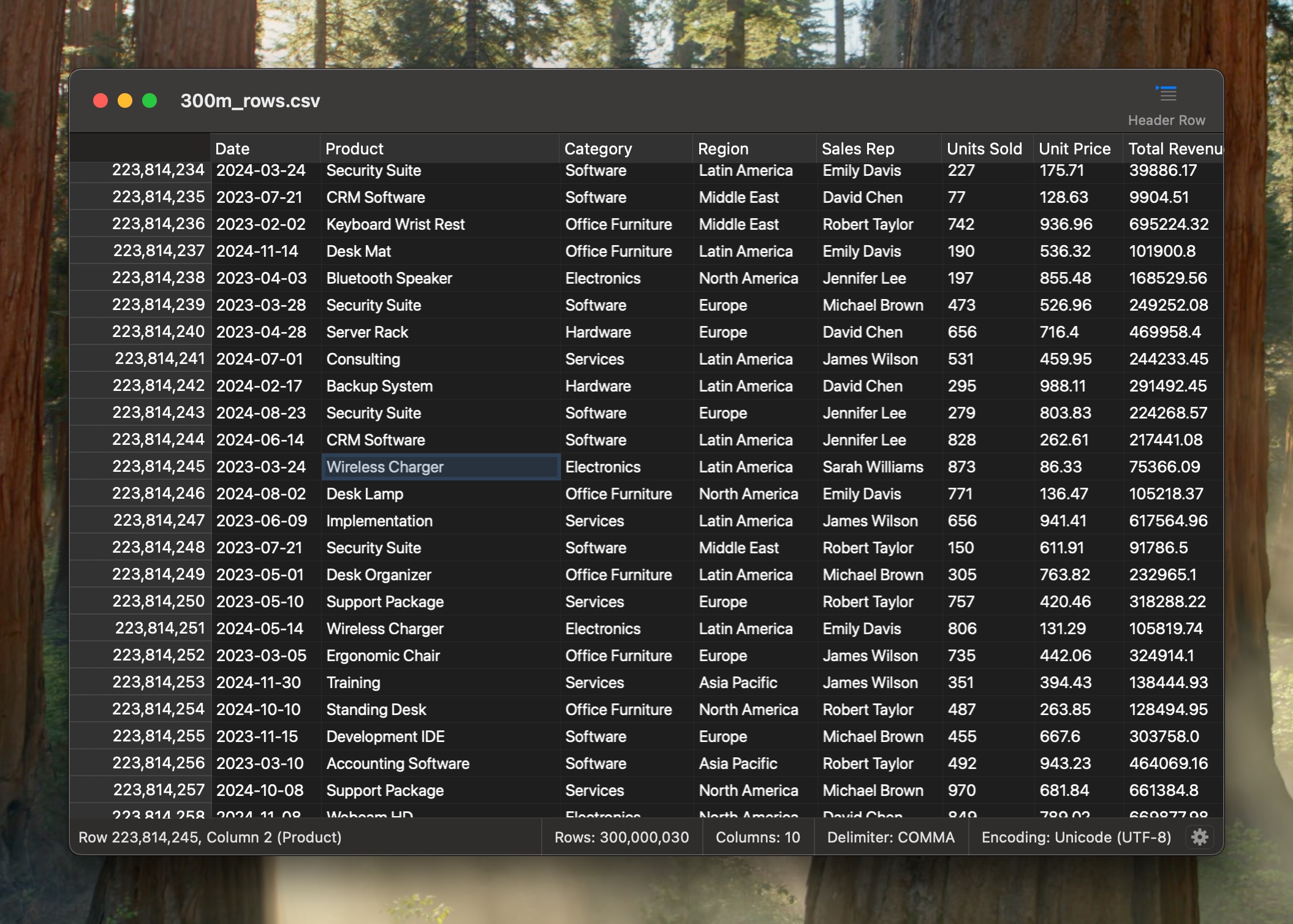 The file shown below is a 27GB synthetic dataset with over 300M rows.