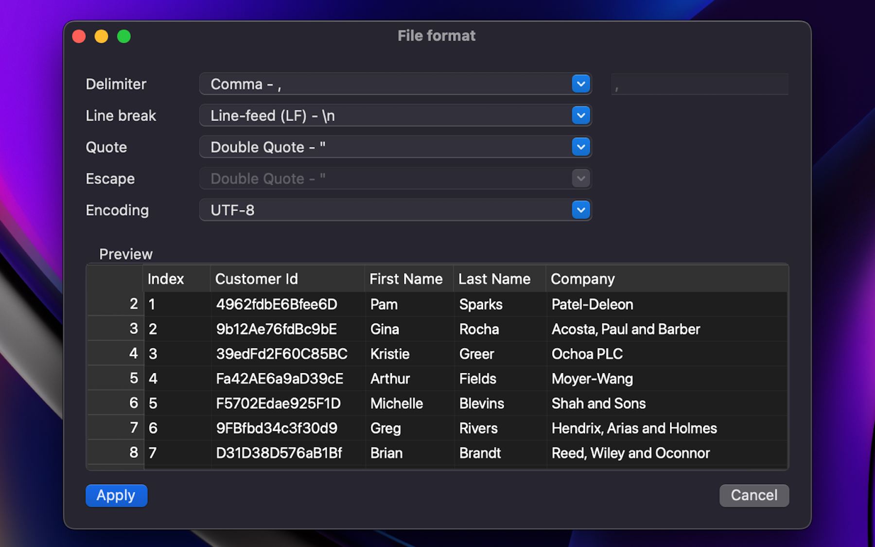 - Flexible format configuration — Customizable delimiters, line breaks, and quote characters